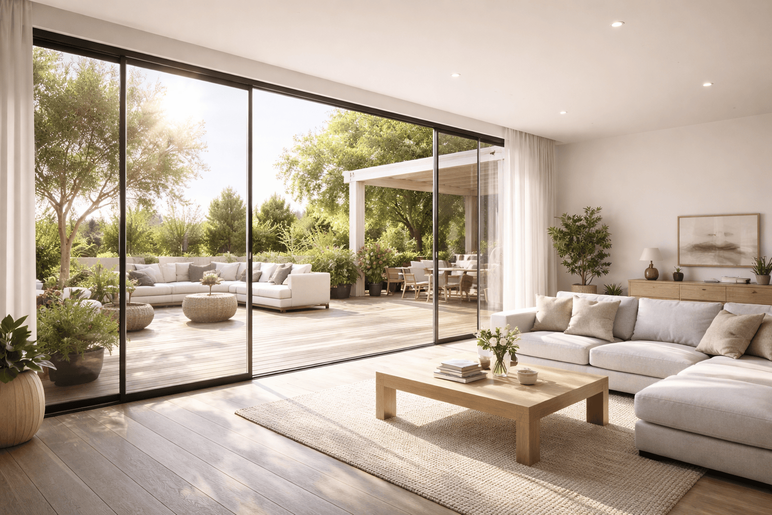 Un perete glisant sticla poate fi integrat cu pergole retractabile sau acoperisuri mobile, permitand combinatii functionale pentru spatii exterioare moderne.